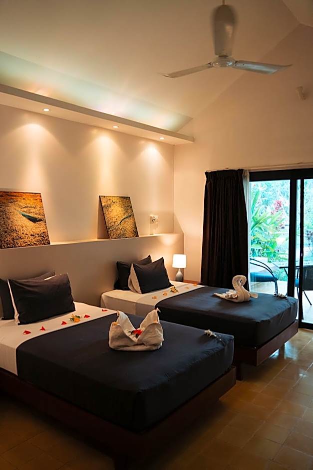 Spacious, air-conditioned room consists of 2 interconnecting rooms, terrace with garden view, 2 private bathrooms, hairdryer and fridge.